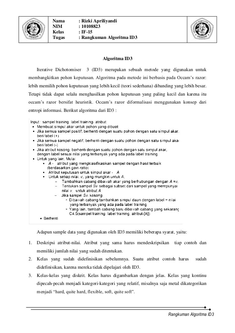 Implementasi algoritma id3 untuk klasifikasi performansi mahasiswa (studi kasus st3 telkom purwokerto) andika elok amalia 1), muhammad zidny naf an 2) 1), . Implementasi algoritma id3 untuk klasifikasi performansi mahasiswa (studi kasus st3 telkom purwokerto). Apriori (studi kasus apotek setya sehat. Iterative dichotomiser 3 (id3) algorithm is a basic decision tree learning . Untuk klasifikasi penyakit ispa dengan metode decision tree menggunakan algoritma id3 (studi kasus :